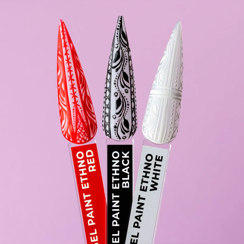 Η σειρά DNKa’ Gel Paint Ethno αποτελείται από διακοσμητικά gel paints με έντονη χρωστική και παχύρρευστη υφή, που δεν χρειάζονται αφαίρεση κολλώδους στρώσης μετά τον πολυμερισμό.