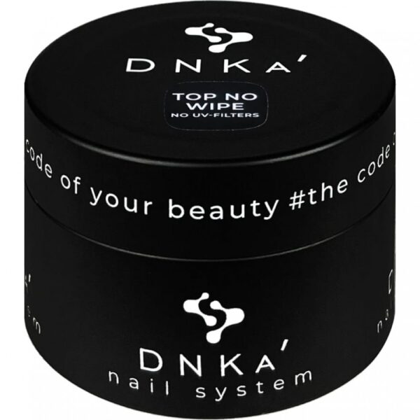 Το DNKa Top Coat No Wipe Νo UV-filters παρέχει τέλεια ανθεκτικότητα, αποτρέπει το ράγισμα, το θρυμματισμό και τις γρατσουνιές, δεν είναι κολλώδη και είναι χωρίς φίλτρο UV. Ιδανικό για σκούρες αποχρώσεις, διατηρεί τέλεια το χρώμα χαρίζοντας ένα άψογο αποτέλεσμα. Έχει ισορροπημένη σύσταση, πιο κοντά στο υγρό , που το κάνει αυτοεπιπεδούμενο, χωρίς να στάζει. Δημιουργεί αξιόπιστη προστασία από μηχανικές βλάβες, διατηρεί το χρώμα και προσδίδει λάμψη που διαρκεί.
